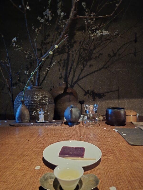 梅の花を楽しめるように、薄暗くした部屋でのお茶教室でした。