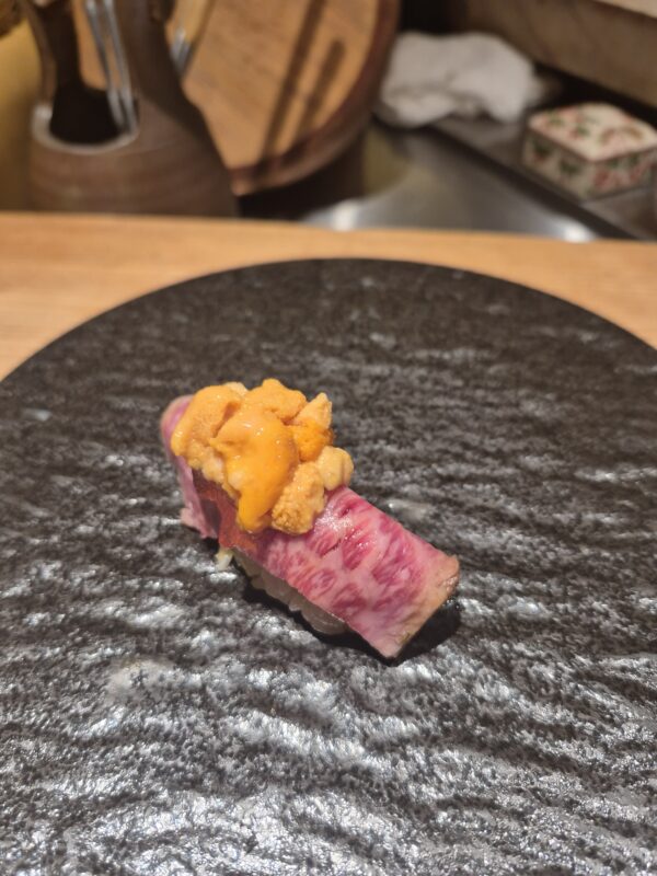 牛肉にウニが乗っかっています。