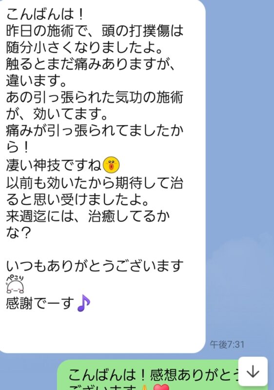 頭の打撲傷があった方、ヒーリング直後から変化があったそうです。